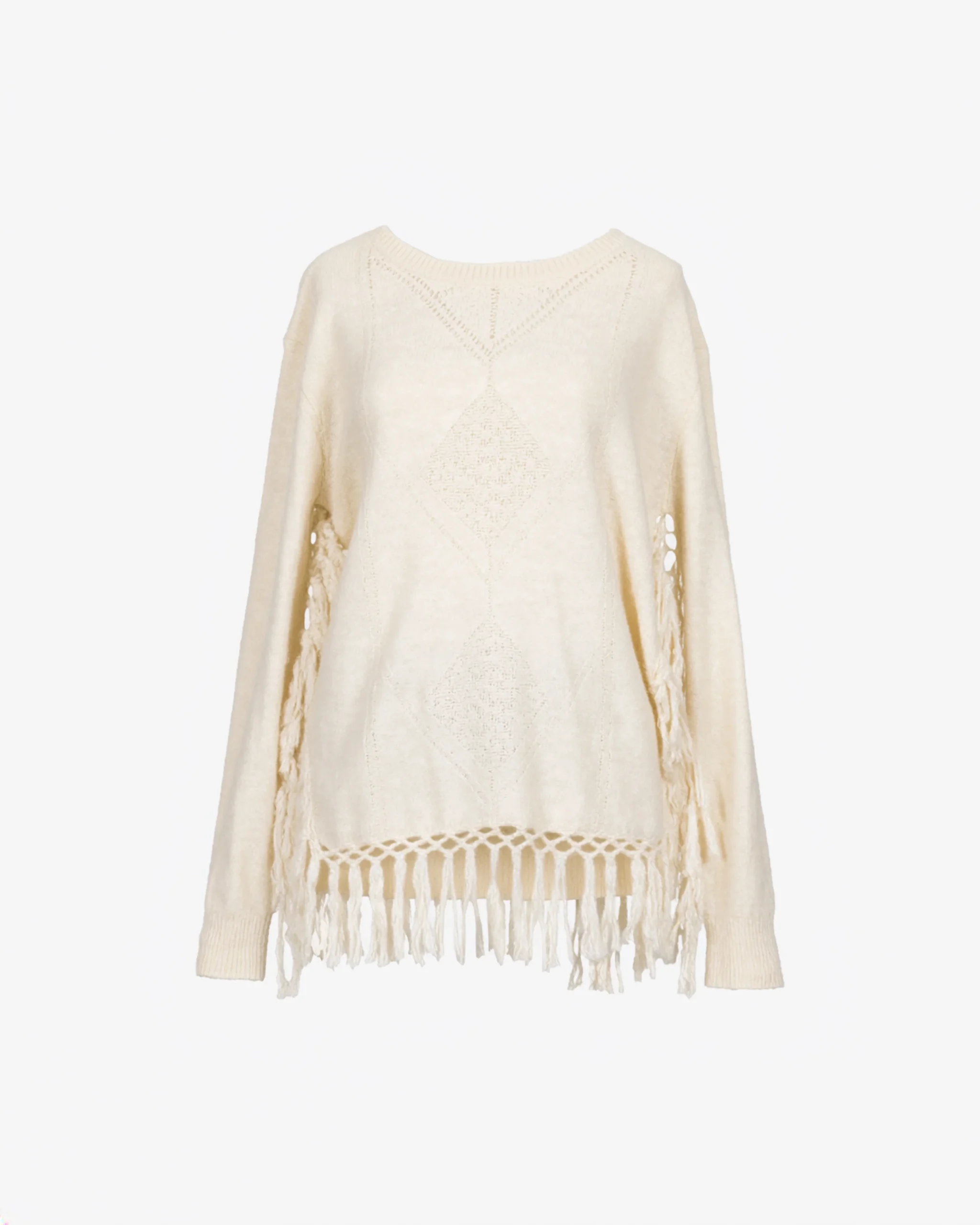 Ce pull à encolure arrondie se distingue par sa teinte ivoire lumineuse et sa maille délicate ornée de motifs graphiques en relief sur le devant. Sa silhouette singulière est magnifiée par de longues franges souples qui bordent les flancs et la base, apportant un mouvement aérien et une touche bohème à la pièce.