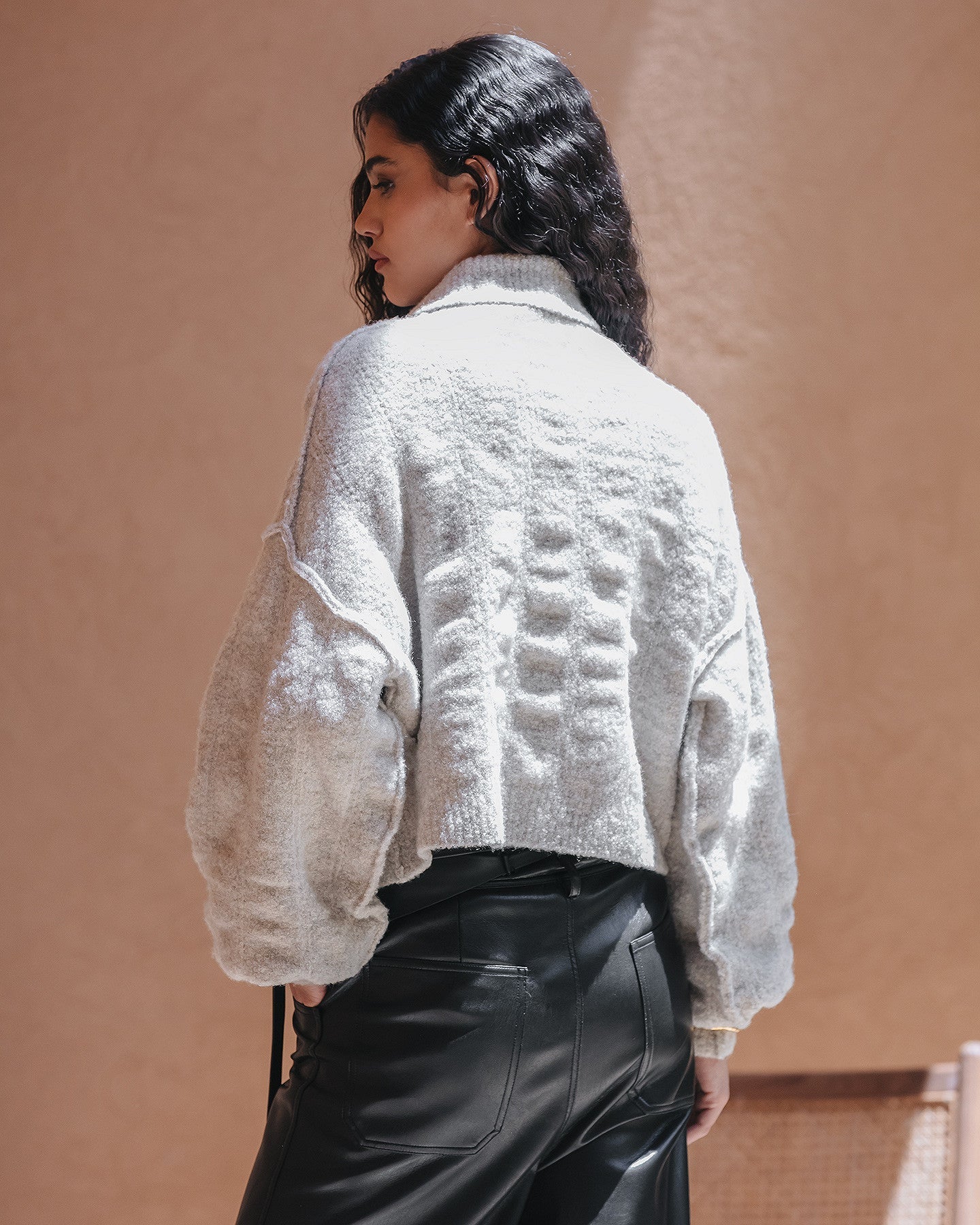 Version moderne et légère du petit pull court dans les doux tons de gris pour assortir parfaitement à nos tenues d’hiver. Son effet cloqué donne de la matière à la laine et lui apporte un confort doux et enveloppant. Le col roulé est souple tandis que de longues manches souples sont un gage de style au modèle.