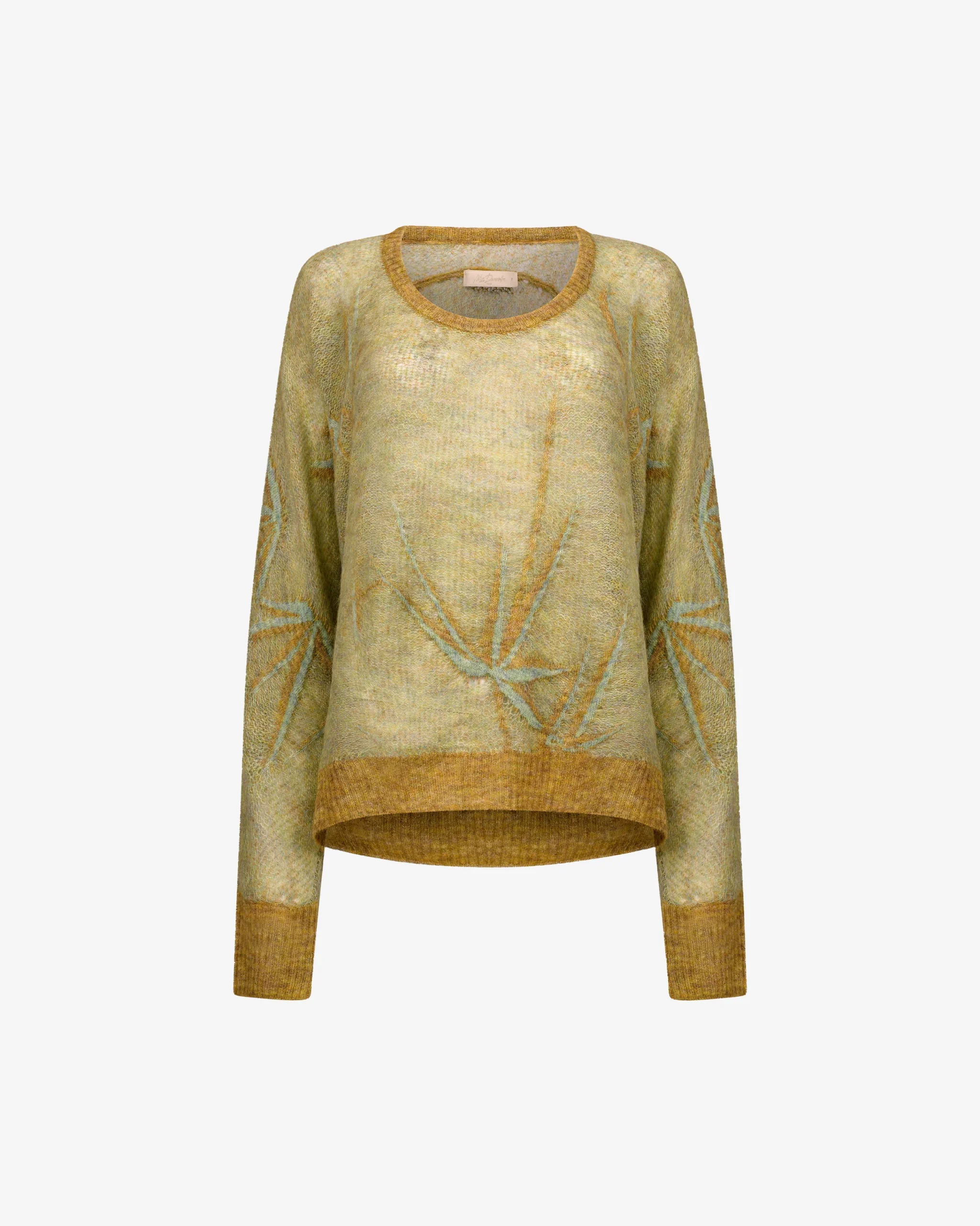 Ce pull à encolure ronde se distingue par sa maille vaporeuse ornée d’un imprimé végétal onirique aux nuances de vert sauge et d’ocre. Sa silhouette est soulignée par des finitions en bord-côte contrastées aux poignets et à la taille, apportant une structure délicate à sa coupe fluide.