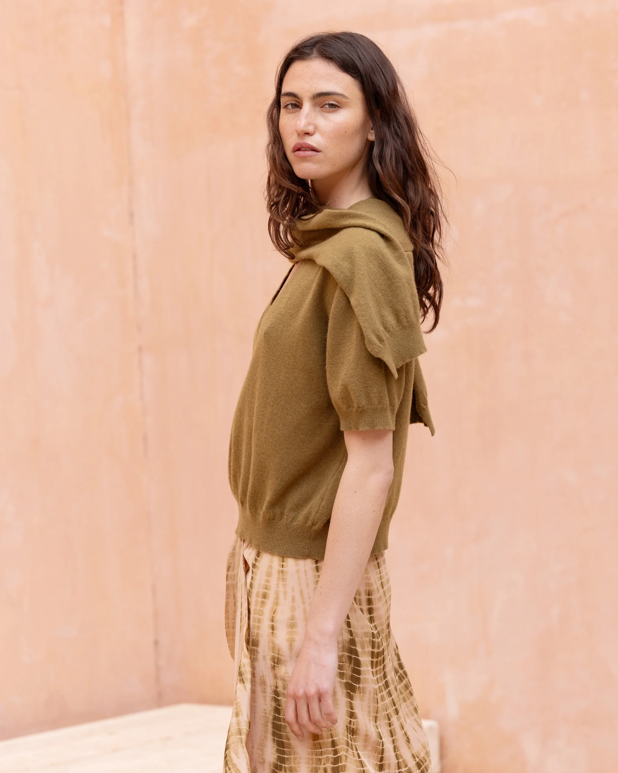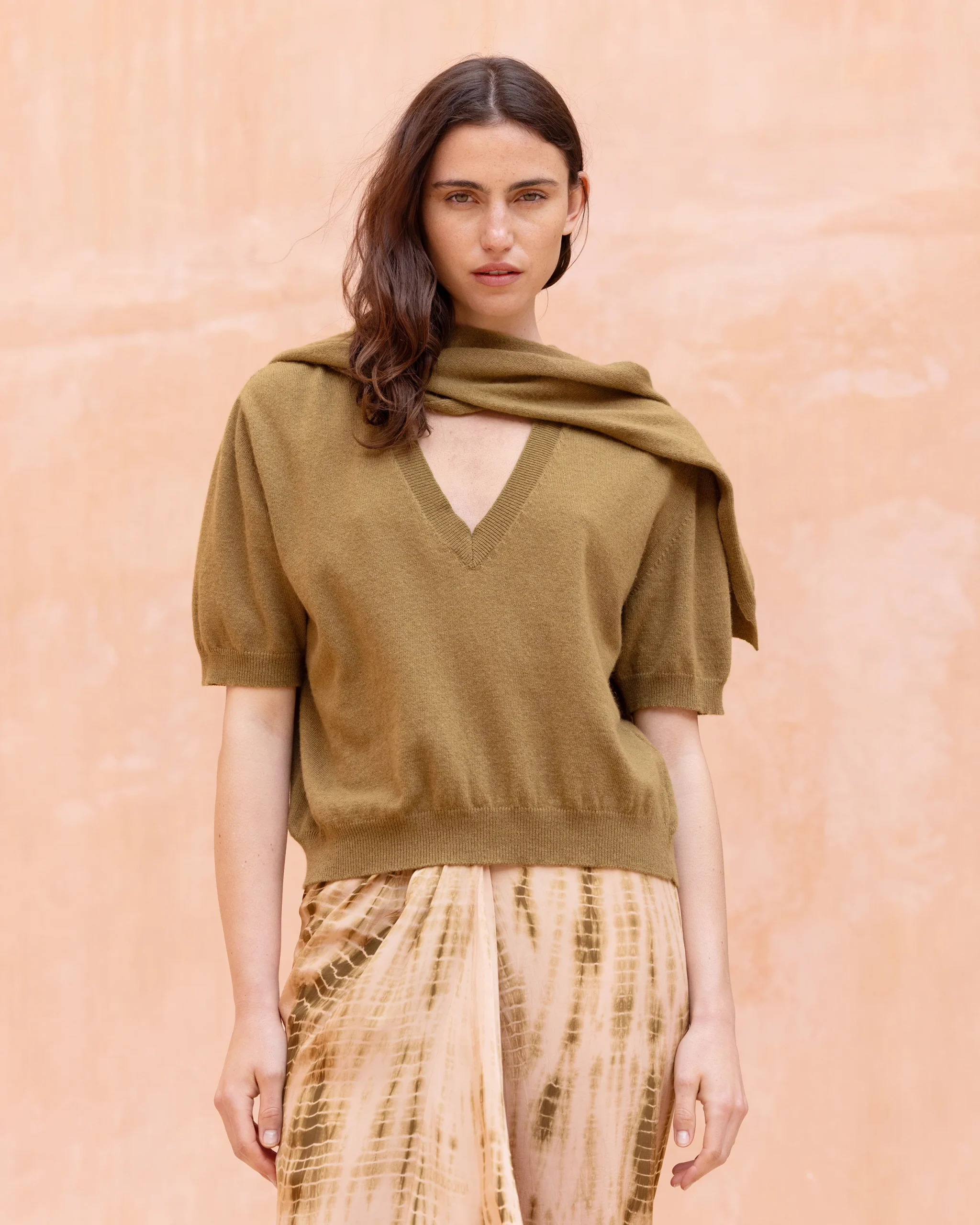 Tricoté dans un fil italien haut de gamme marron olive mêlant cachemire et laine mérinos, ce pull court associe douceur, chaleur et raffinement. Son encolure en V est prolongée par une écharpe intégrée, à nouer librement pour souligner le port de tête ou apporter une touche de style. Les manches courtes et la coupe épurée en font une pièce élégante et moderne.