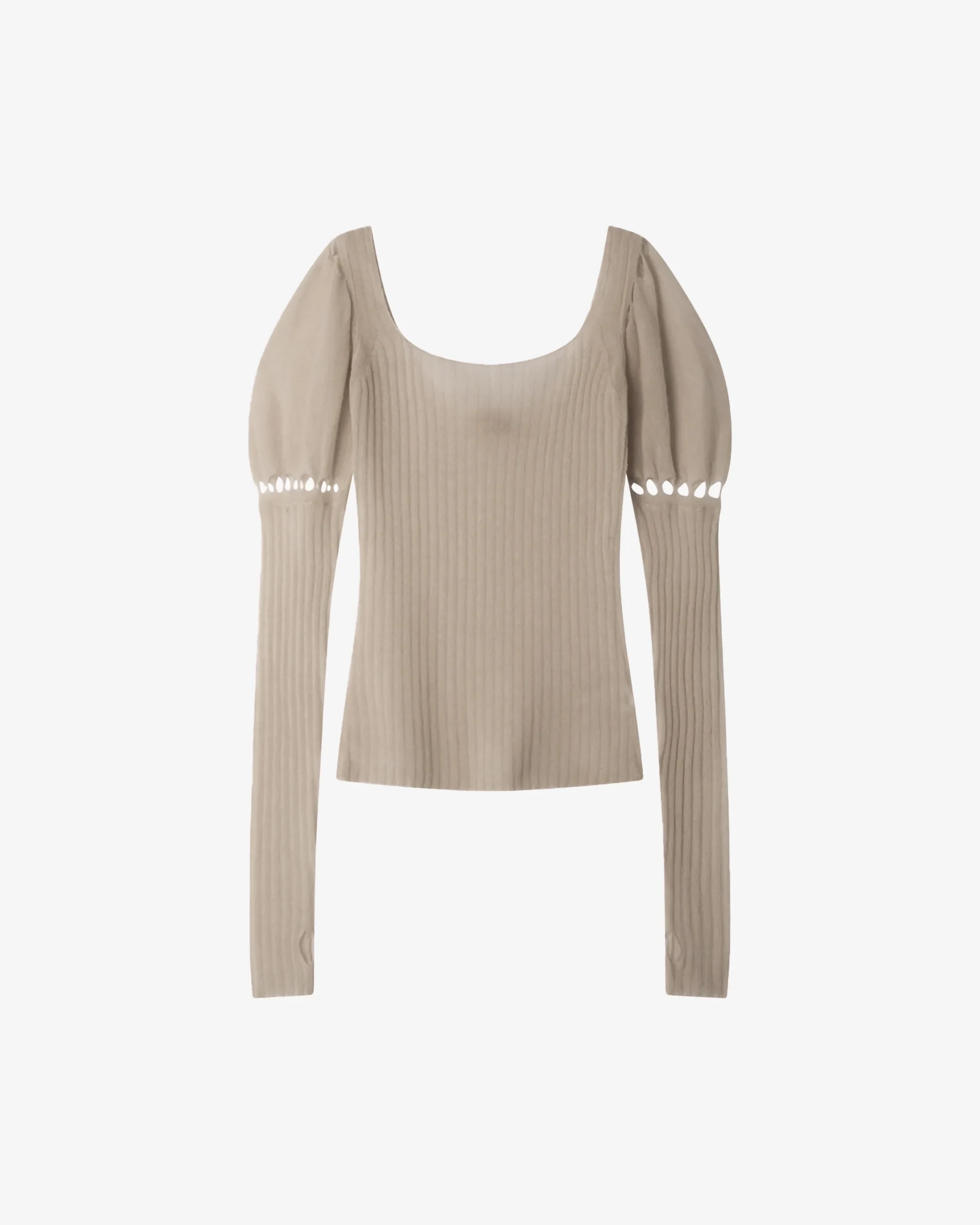Pull élégant affirmée, tricotée dans une maille fine taupe qui épouse la silhouette et offre un col carré flatteur. Sa coupe est sublimée par des manches longues qui s’évasent en un audacieux volume bouffant au niveau des épaules, avant de se resserrer aux poignets. Des petits détails ajourés géométriques sur le long des manches ajoutent une touche de fantaisie discrète et sophistiquée à cette pièce très féminine.