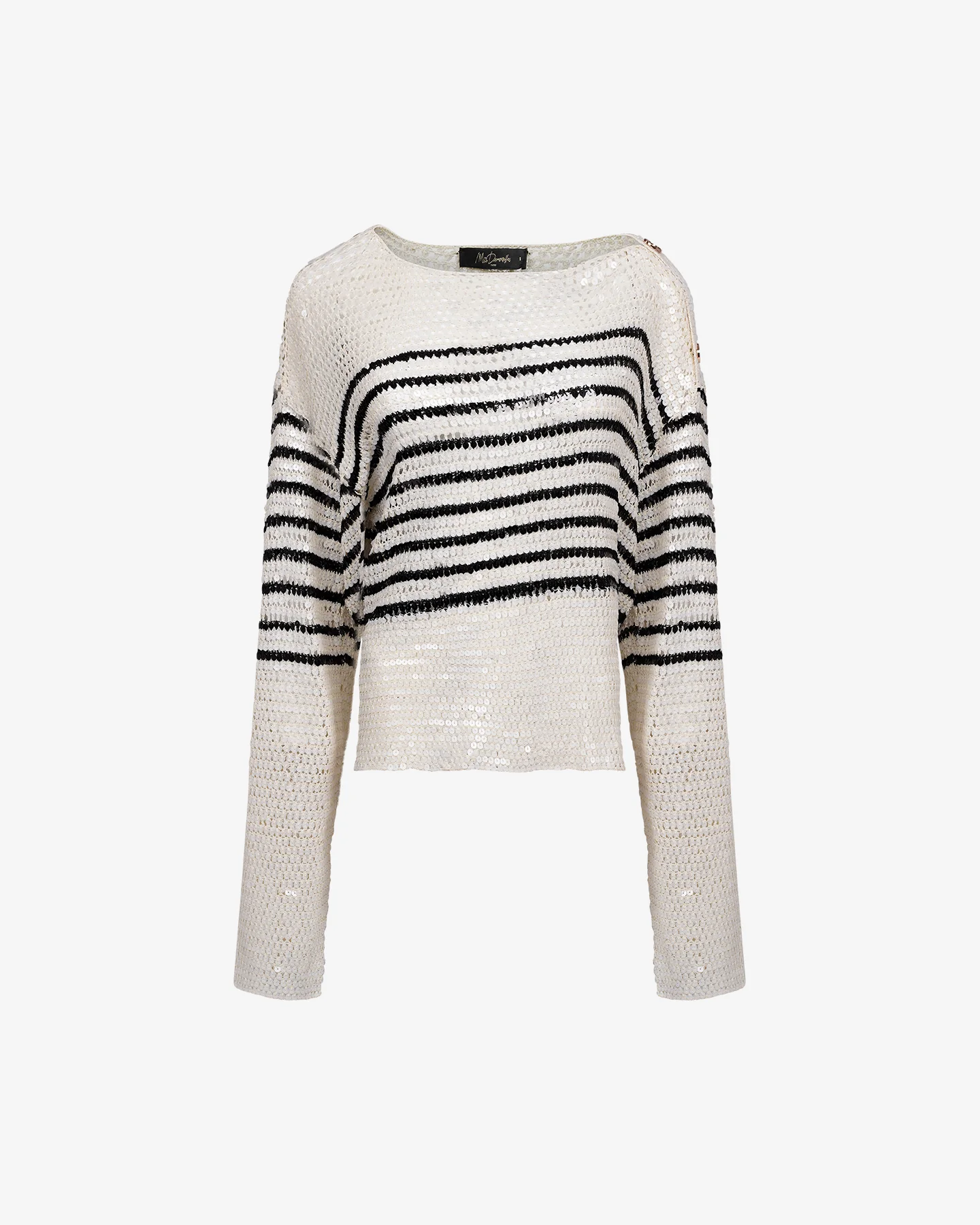 Ce pull en filet de sequins blancs revisite l’iconique marinière avec une brillance sophistiquée grâce à ses rayures horizontales noires contrastées. Sa coupe décontractée est ponctuée de boutons dorés sur l’épaule, ajoutant une touche d’élégance nautique à cette pièce lumineuse.