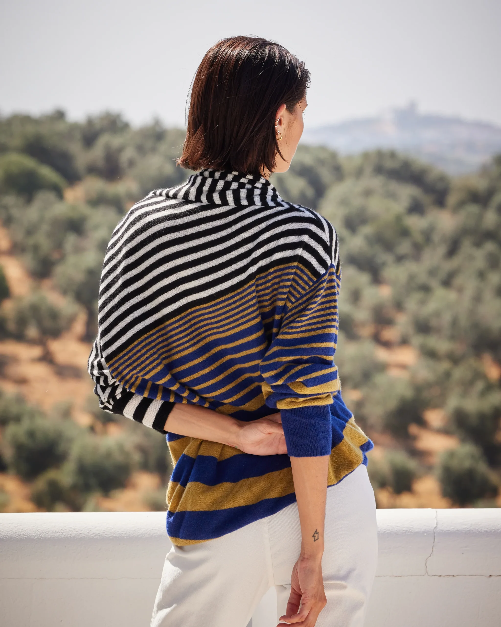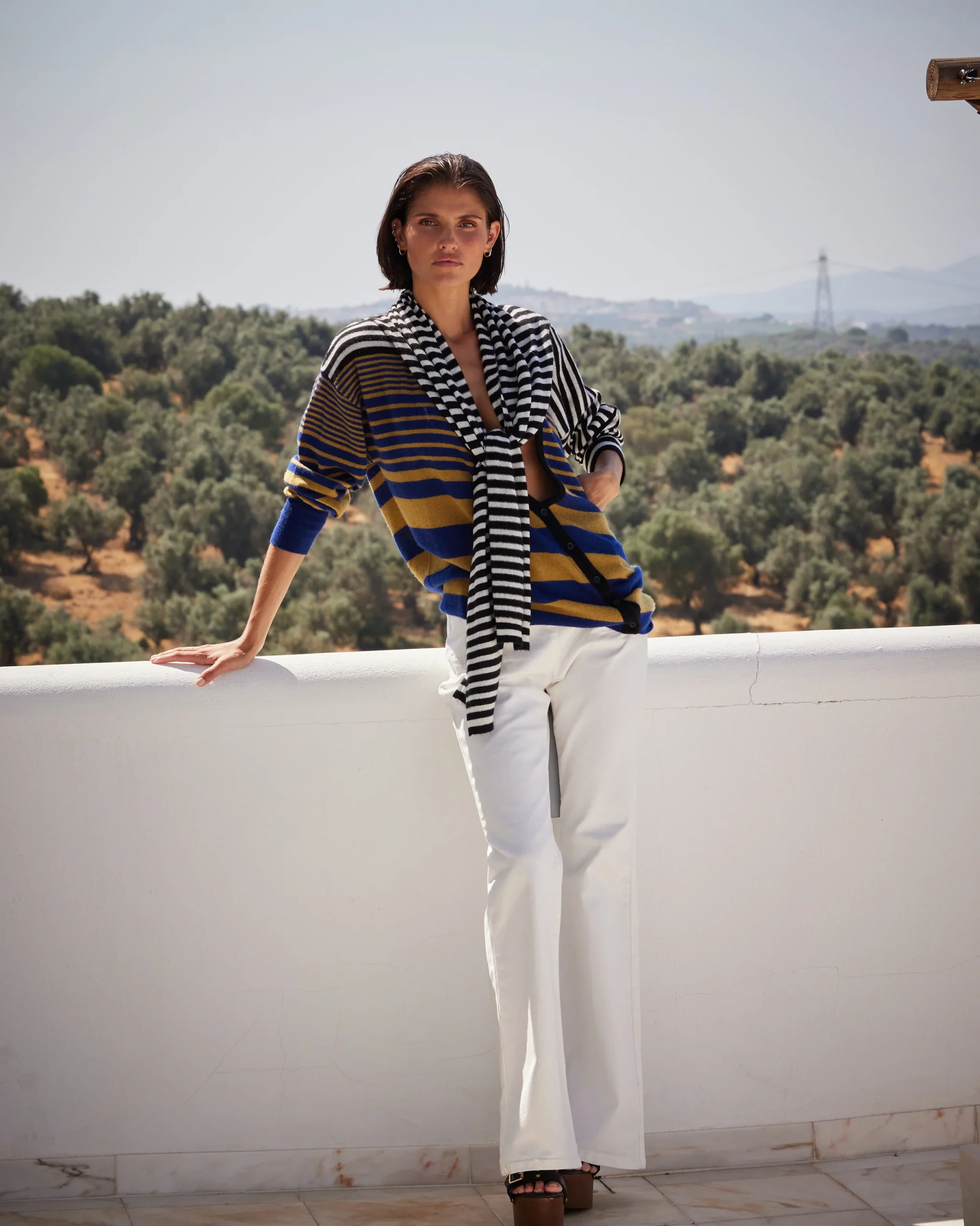 Cardigan tricoté dans un mélange luxueux de cachemire et soie, doux et léger. Sa coupe asymétrique est rehaussée d’un jeu de rayures décalées qui apportent modernité et mouvement. Une écharpe est intégrée à l’encolure, ajoutant une touche élégante et modulable, tandis que les manches longues et la palette kaki, navy et ocre délicat complètent cette pièce raffinée et contemporaine.