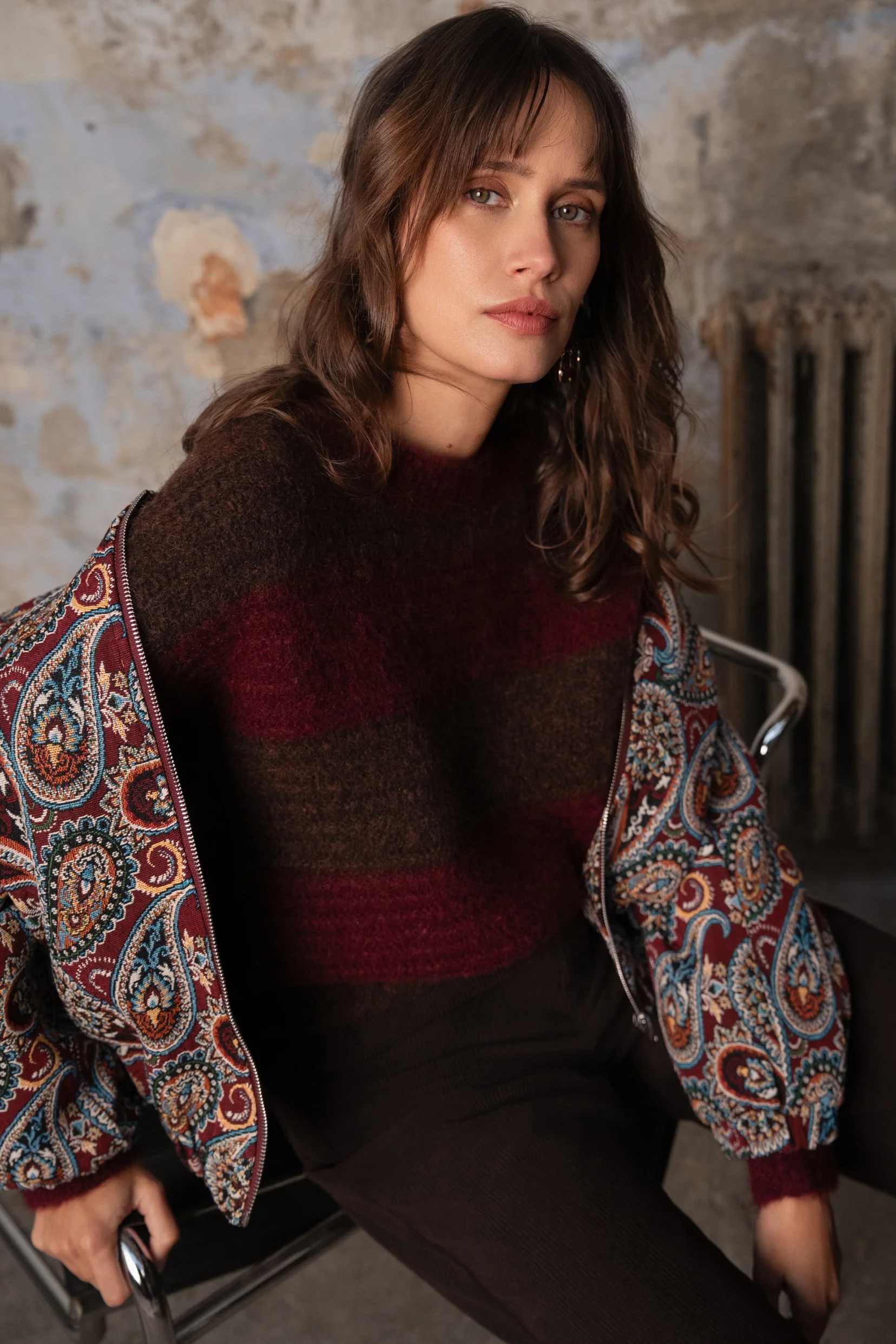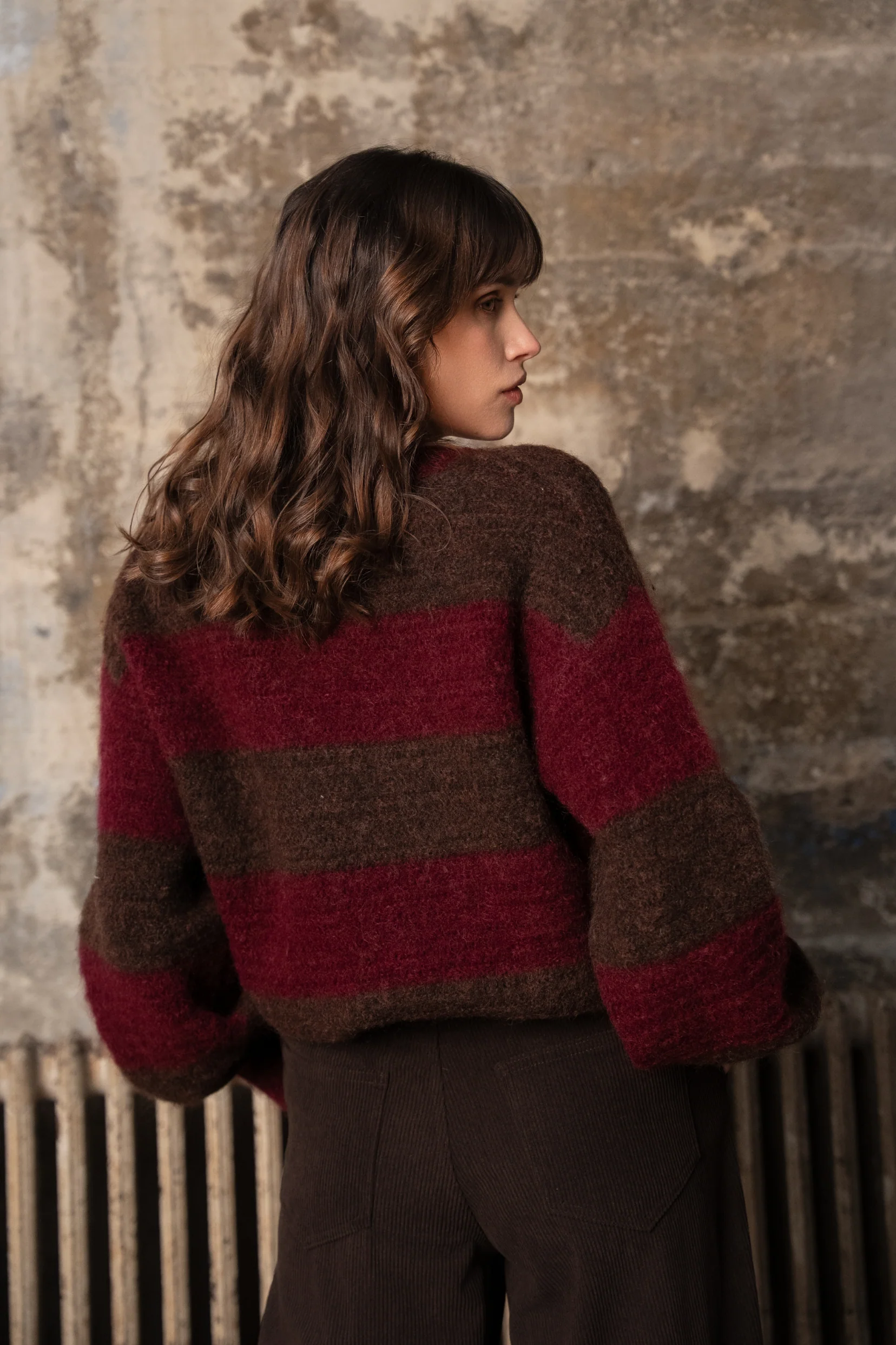 Ses larges rayures aux nuances de bordeaux et chocolat apportent du relief à vos tenues, tandis que sa maille moelleuse enveloppe le corps d’un confort irrésistible.