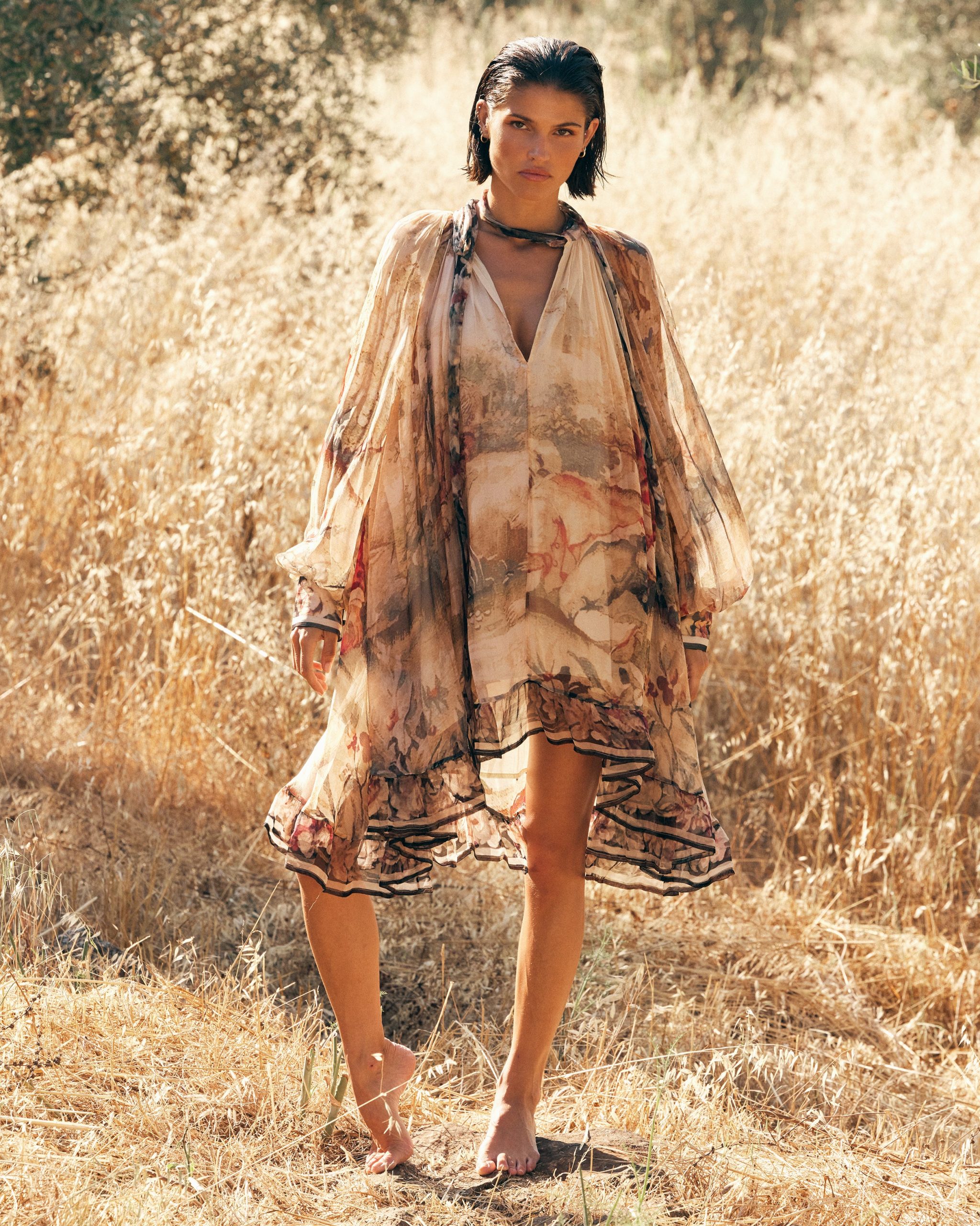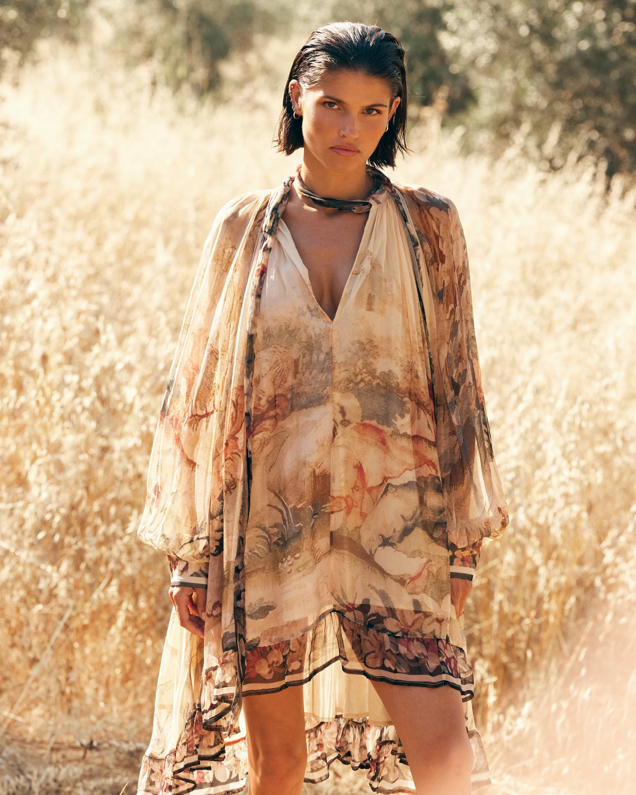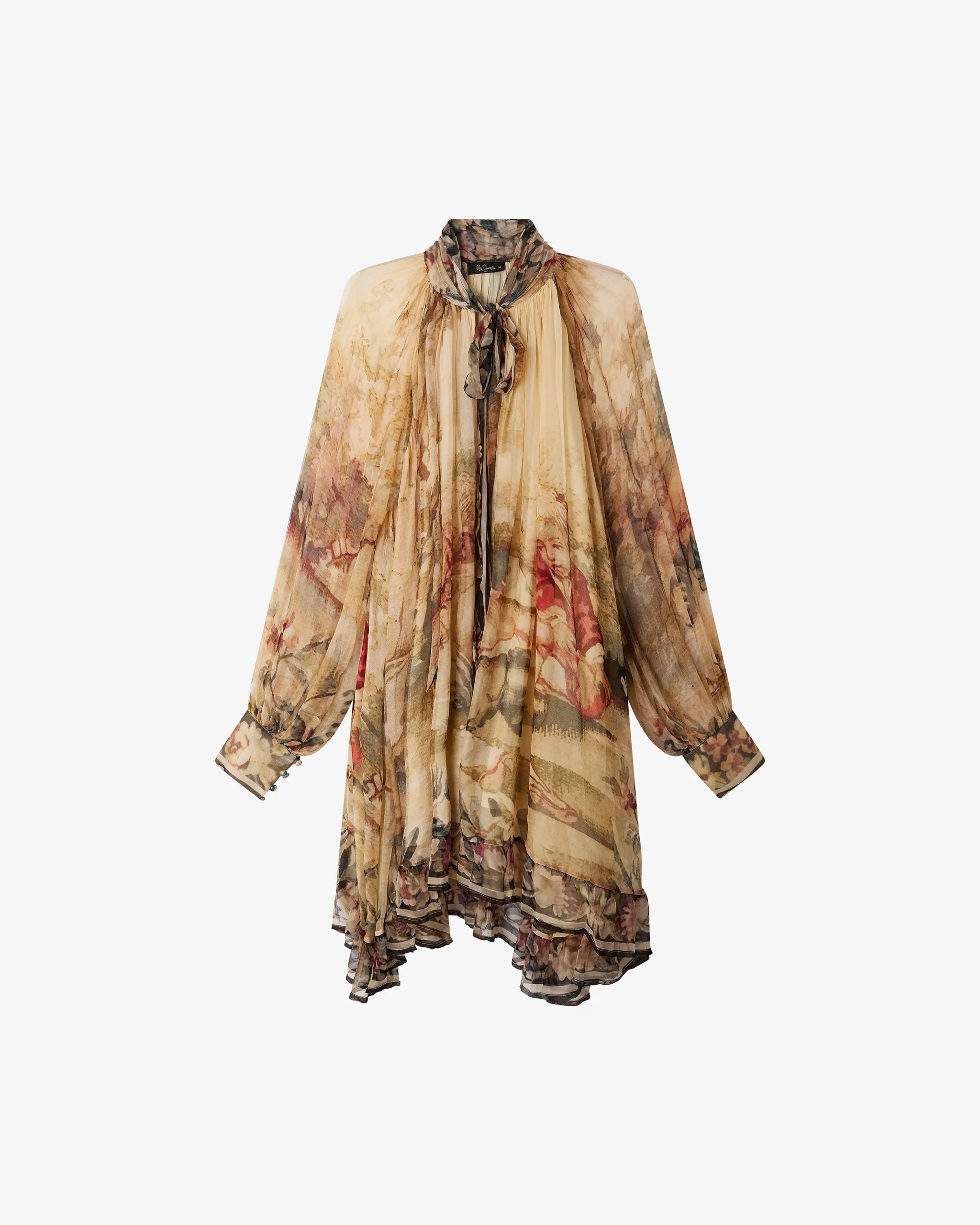 Une robe comme une œuvre d’art, fluide et expressive. Confectionnée en viscose chiffon, elle dévoile un imprimé tableau d’inspiration baroque aux tonalités vibrantes, posé sur un fond écru lumineux.