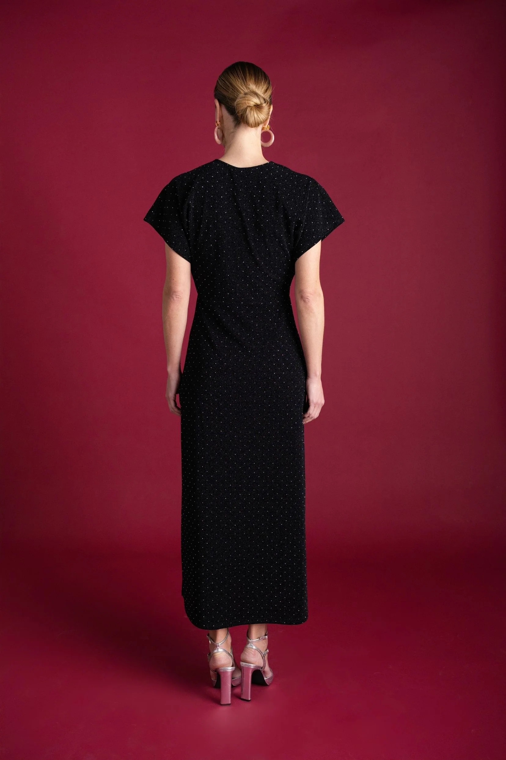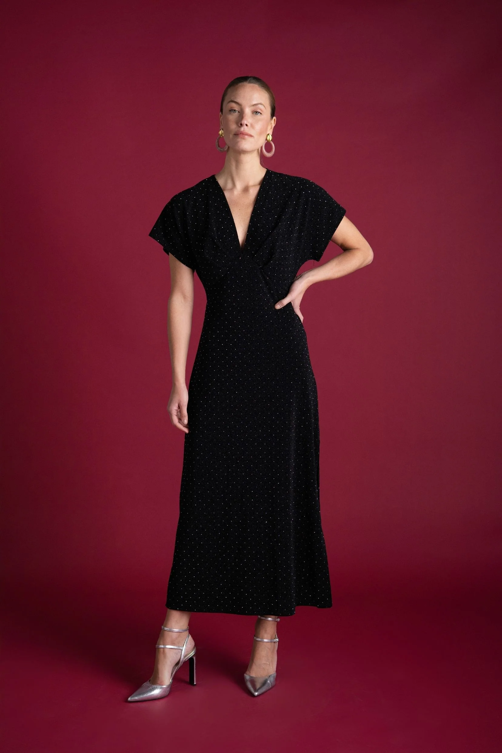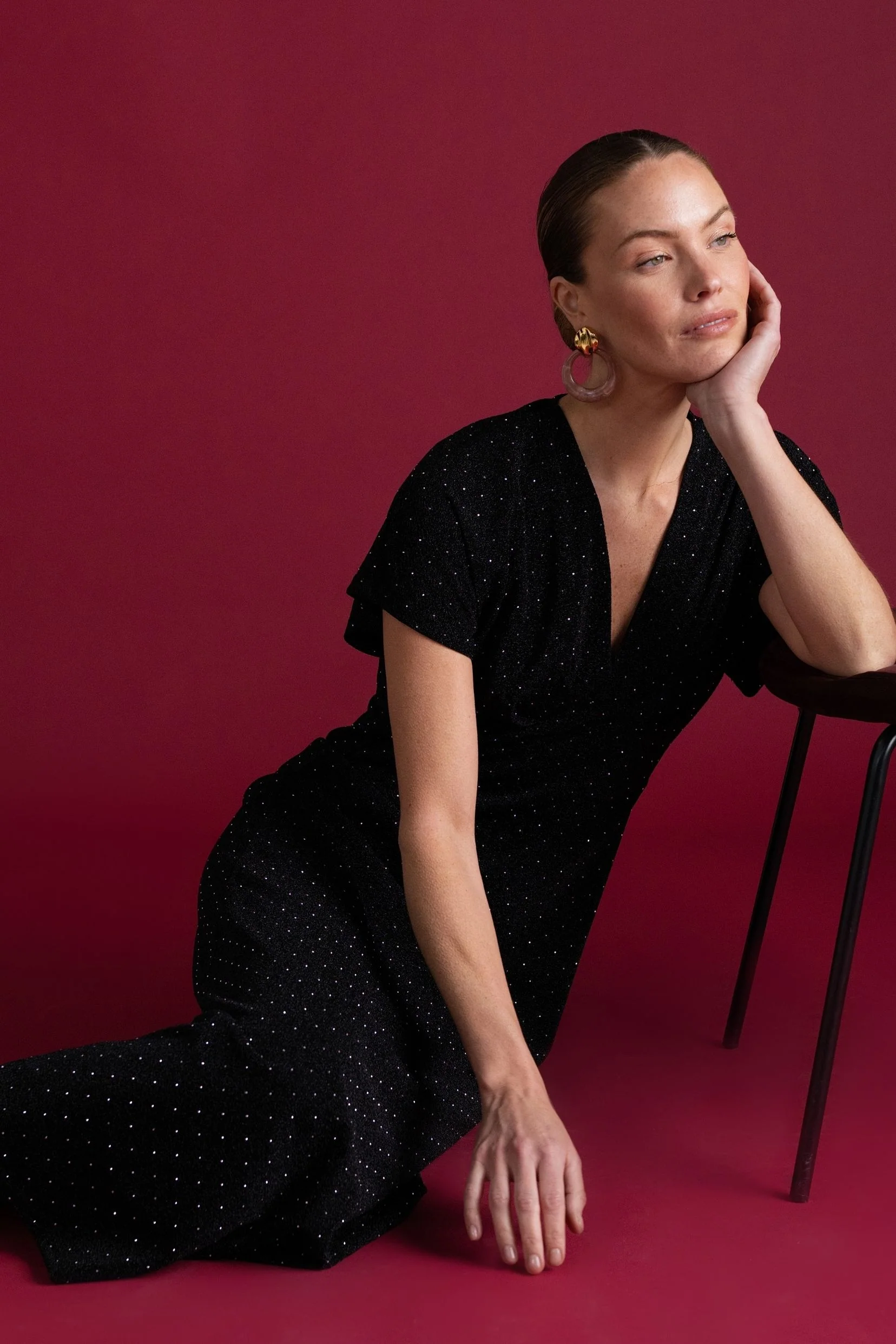 Sa coupe longue structure l’allure, tandis que son décolleté en V vient sublimer la féminité avec justesse. Les manches papillon apportent une fluidité aérienne, donnant à la robe cet esprit élégant et moderne qui signe l’ADN de Kilky Paris.