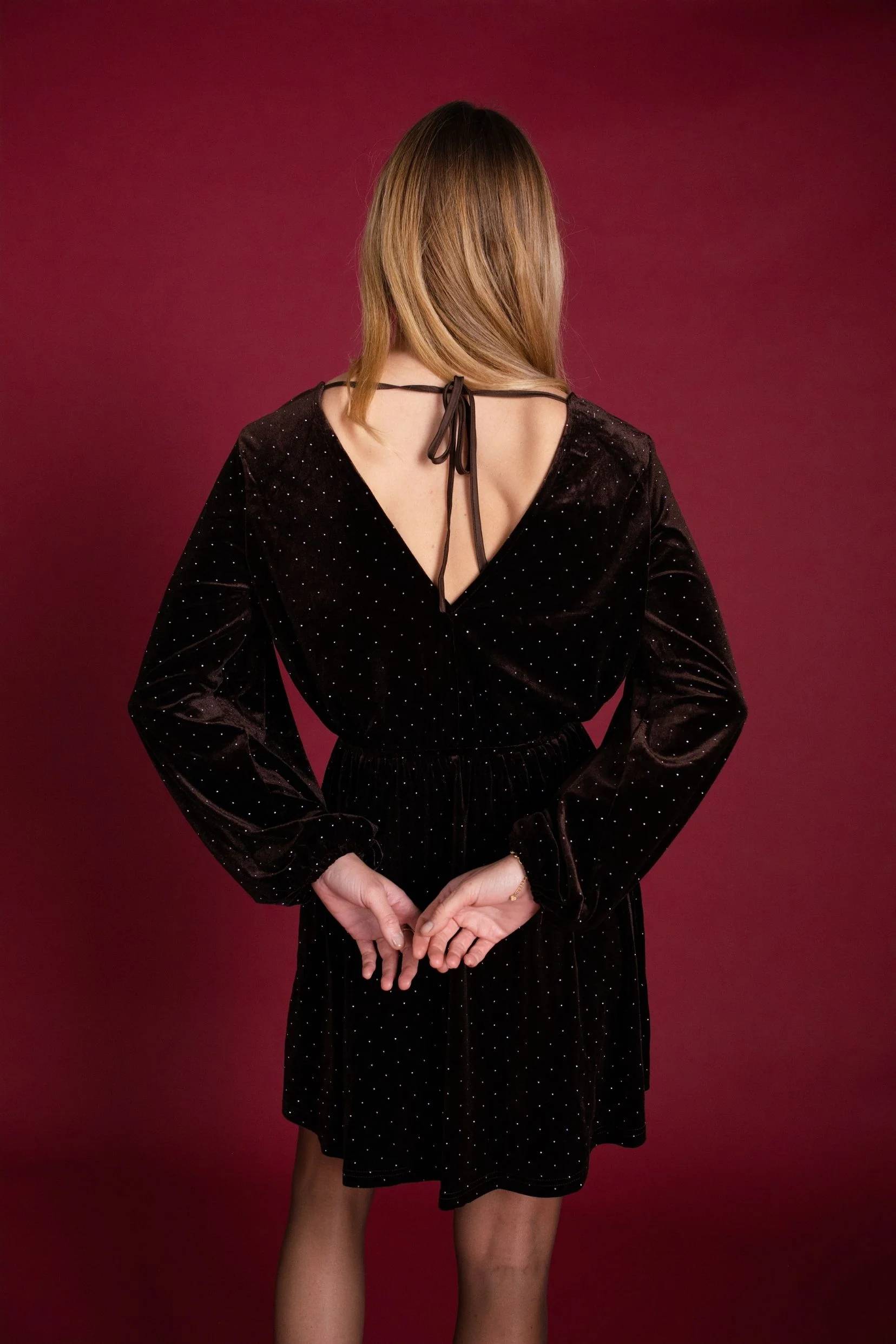 Son velours café, doux comme une caresse, accroche la lumière grâce à ses micro-pierres délicatement incrustées comme une pluie d’étoiles posée sur le tissu. Une pièce qui scintille sans jamais briller trop fort, pensée pour celles qui aiment l’élégance discrète.