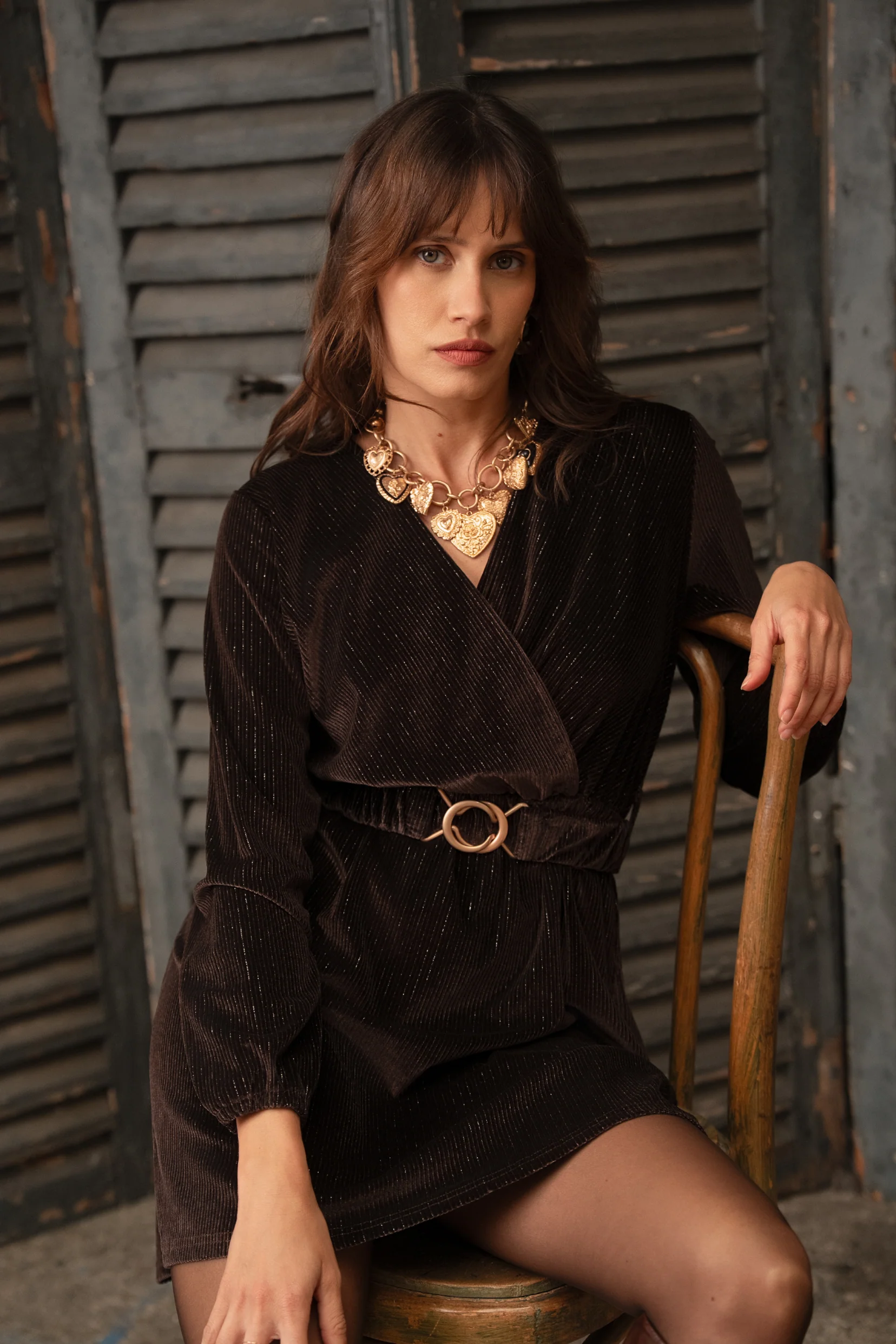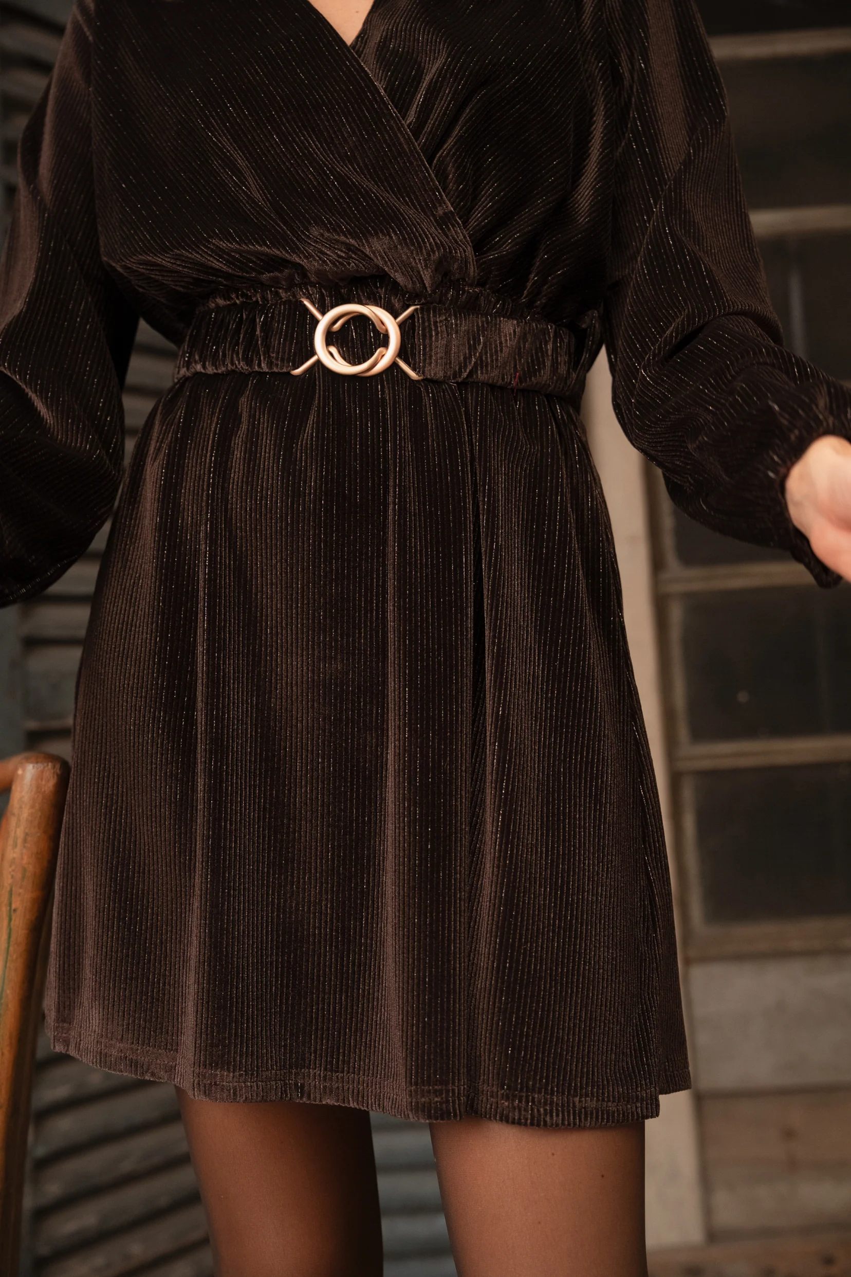 Son tissu subtilement pailleté capte la lumière sans en faire trop, tandis que sa teinte chocolat enveloppe la silhouette de douceur. Son décolleté délicat et sa taille élastiquée, soulignée d’une ceinture assortie, dessinent une allure féminine et fluide.