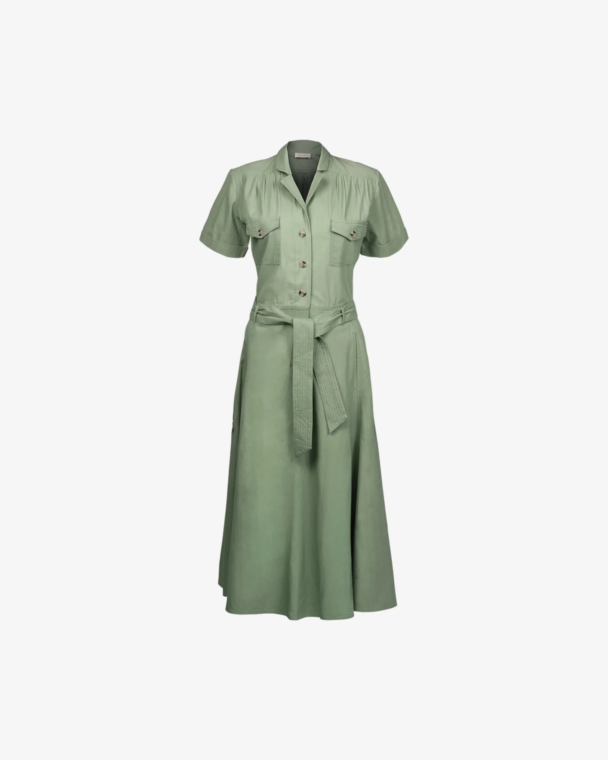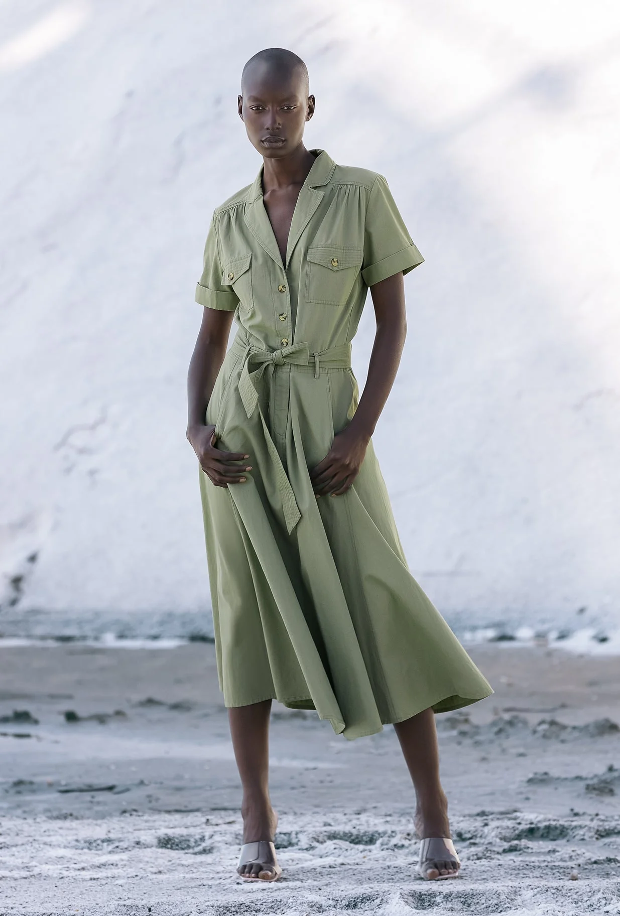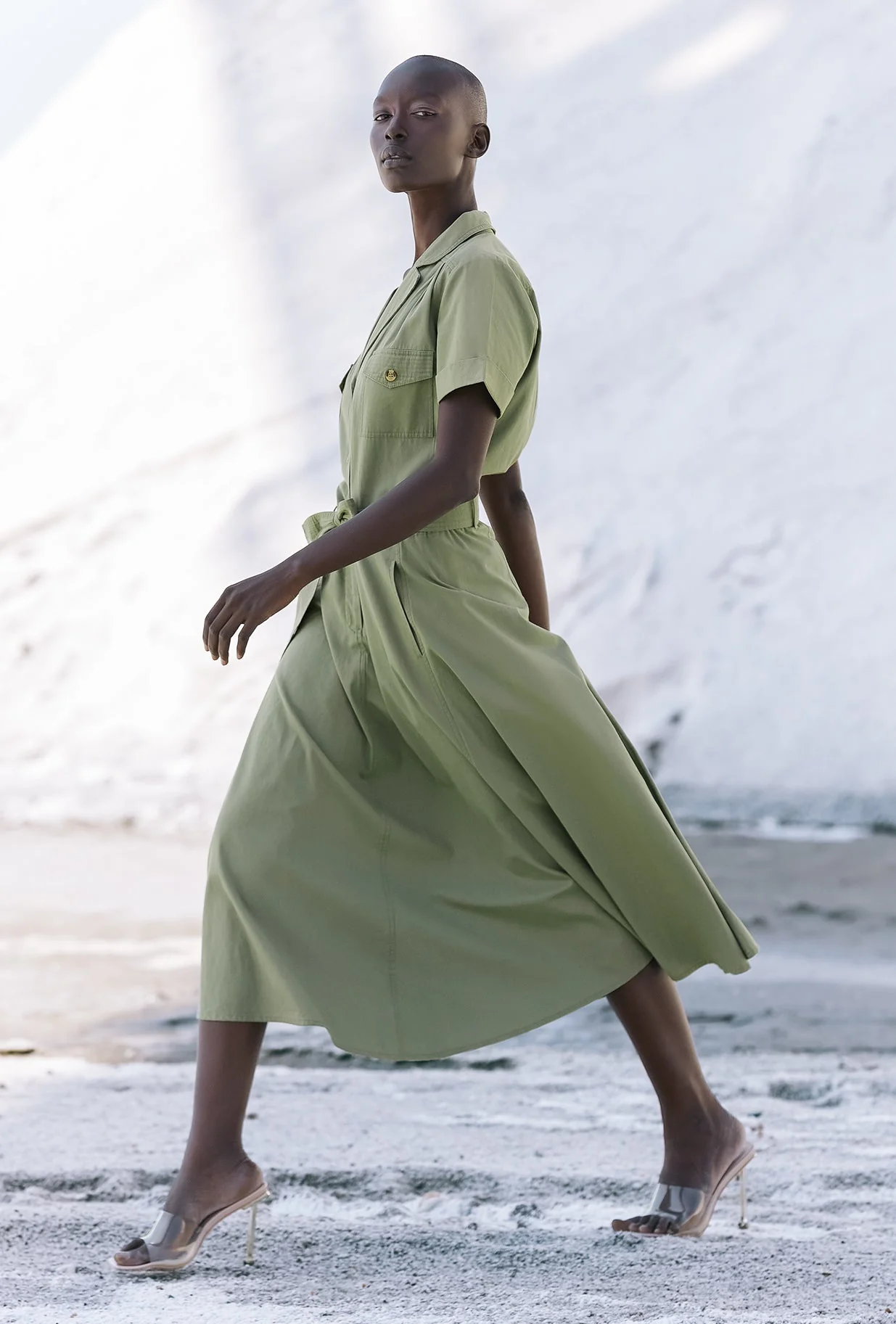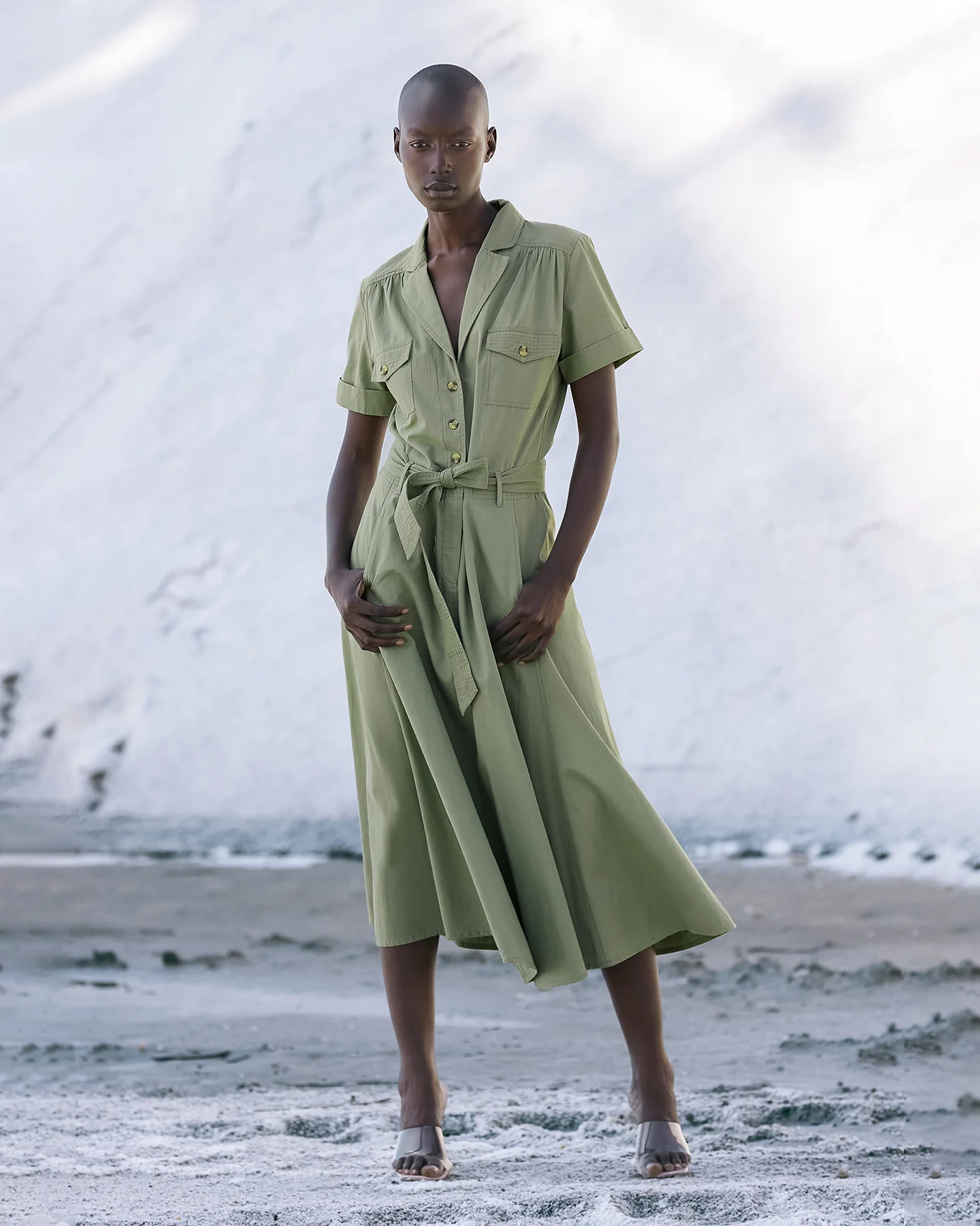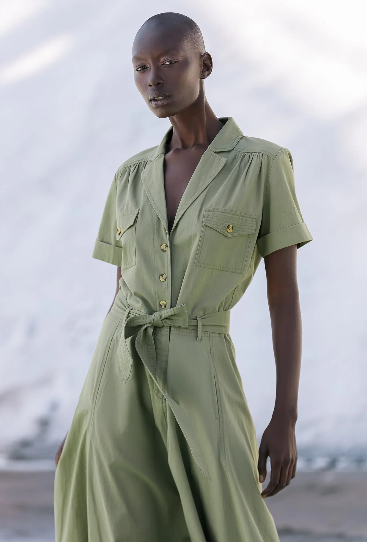 Cette robe est une robe chemise longue d’inspiration safari, caractérisée par une couleur vert. Elle présente des détails classiques de chemise tels qu’un col rabattu, une patte de boutonnage complète, et des poches à rabat sur la poitrine. La coupe est cintrée à la taille par une large ceinture amovible assortie créant une silhouette féminine et structurée.