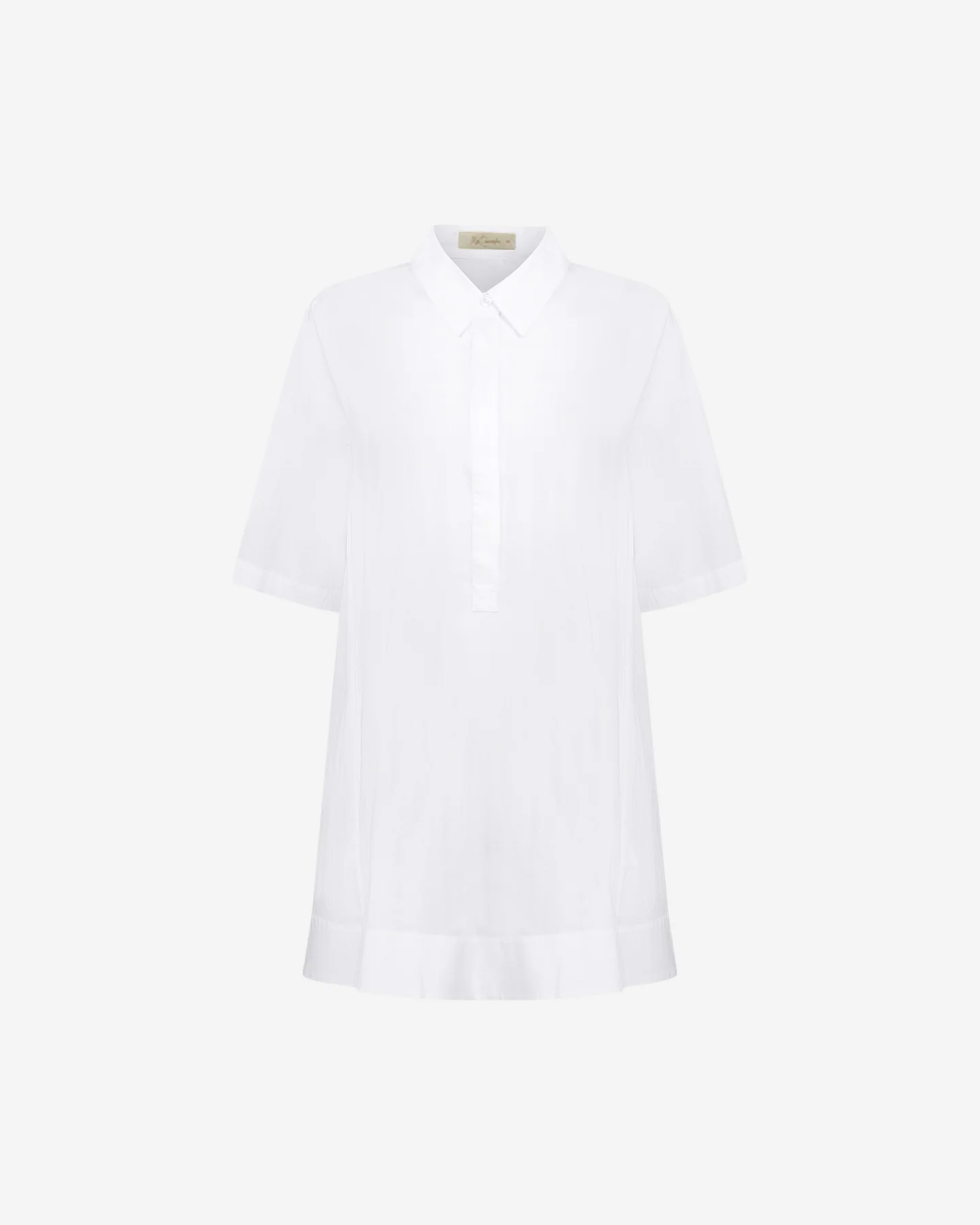 La simplicité est de mise pour notre petite robe blanche en popeline de coton craquante. Des manches courtes mi-longues et un col chemisier sont positionnés sur une coupe évasée originale et élégante. Facile à porter au quotidien, à la ville tout simplement, comme en soirée agrémentée de jolis bijoux, son charme transcende les saisons et vous ramène au présent. Une doublure accompagne le modèle pour éviter la transparence.