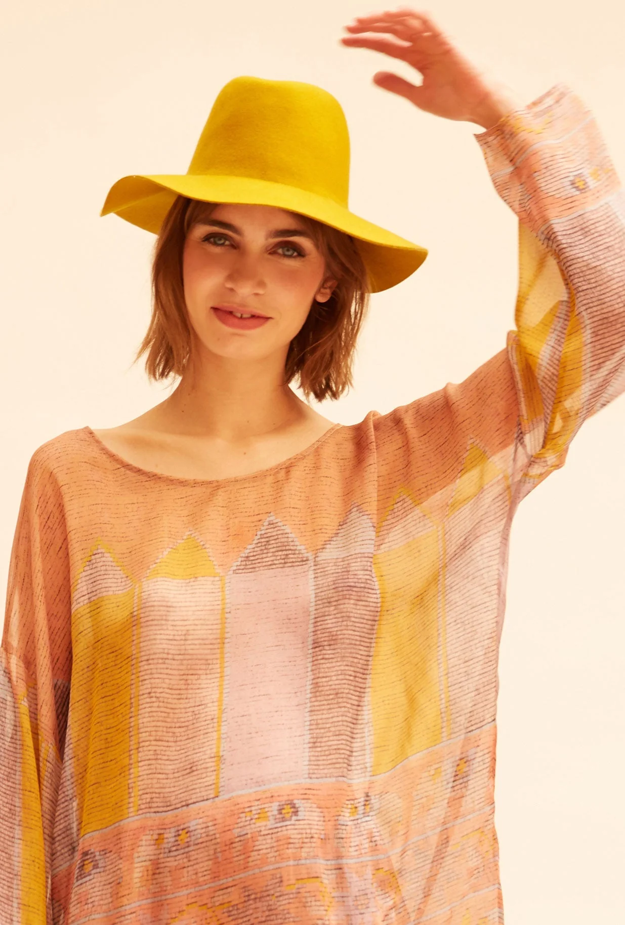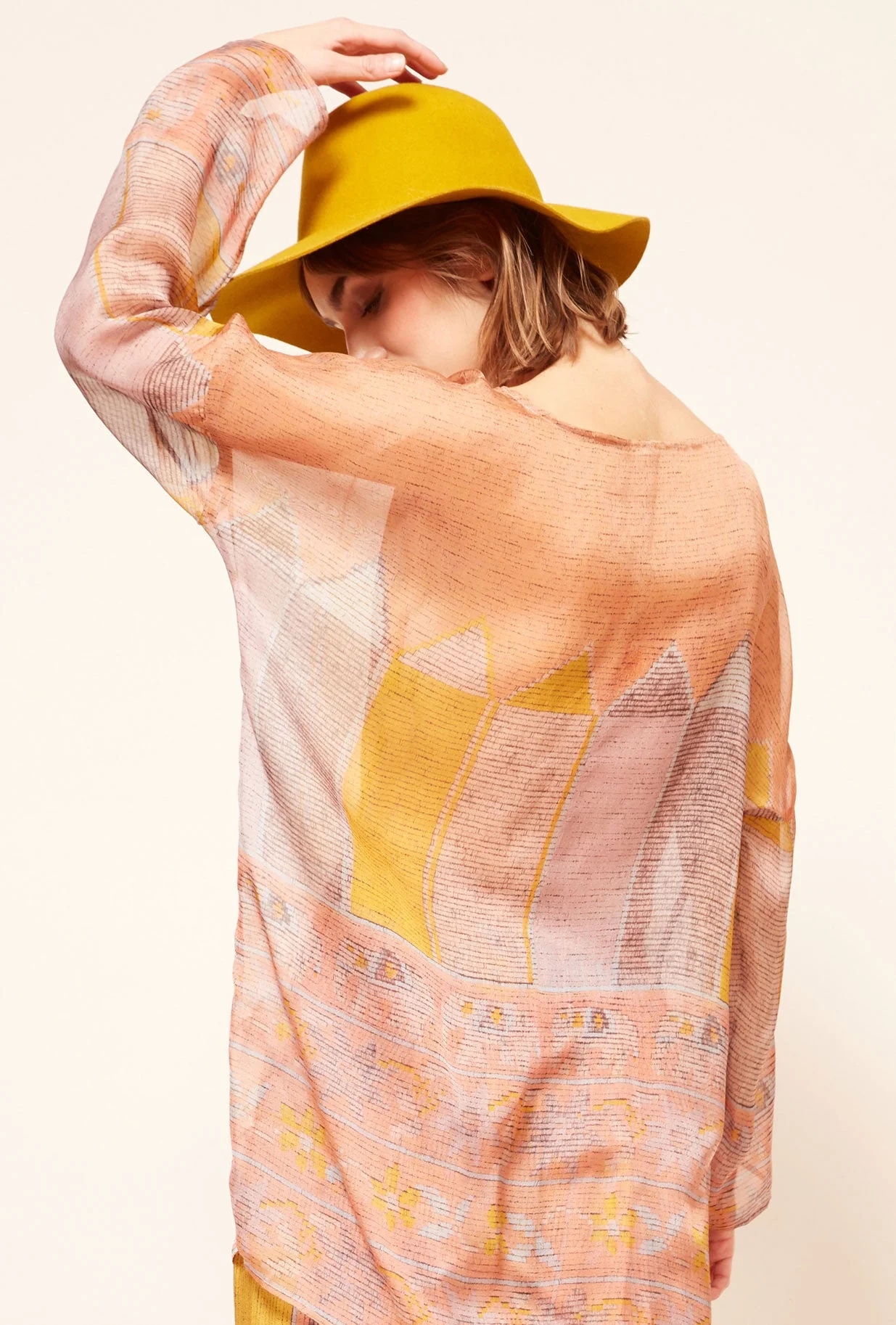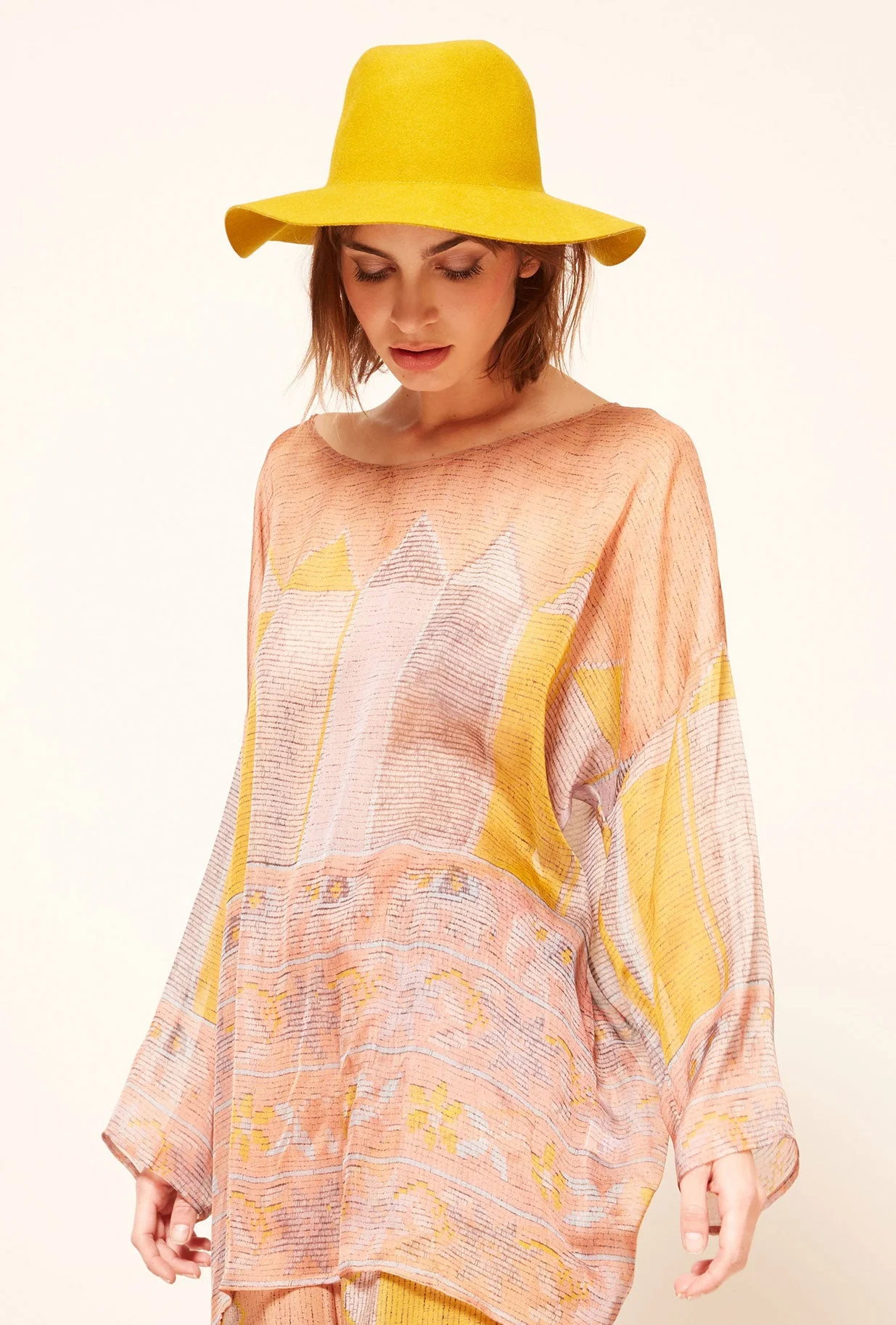 Tunique transparente à joli imprimé couleur, ample et décontracté avec de larges manches et une coupe bateau. Ce modèle taille normalement, prenez votre taille habituelle. Composition : 100% soieConseils d’entretien :- Lavage à la main- Pas de sèche-linge- Repasser délicatement