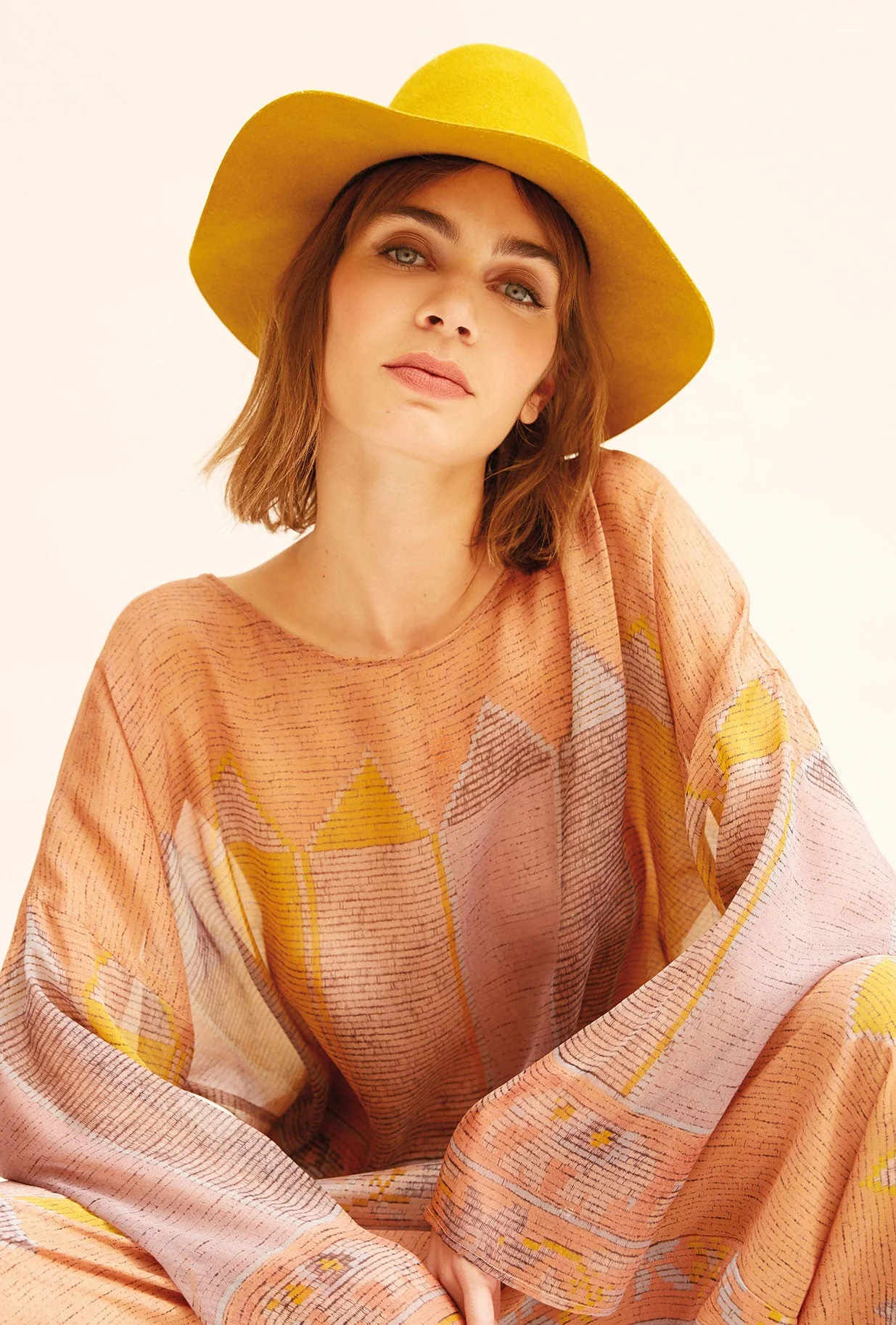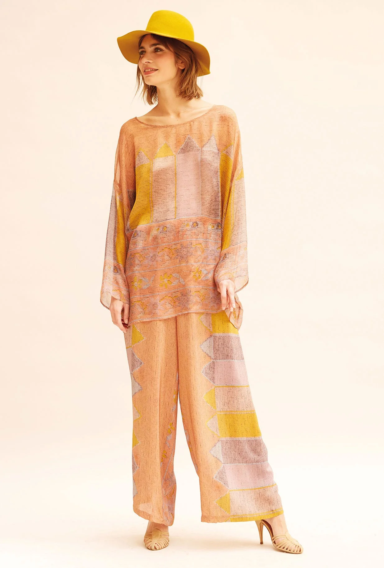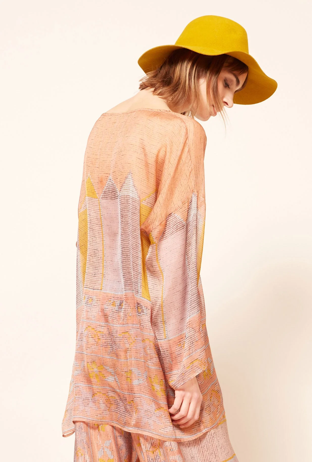 Tunique transparente à joli imprimé couleur, ample et décontracté avec de larges manches et une coupe bateau. Ce modèle taille normalement, prenez votre taille habituelle. Composition : 100% soieConseils d’entretien :- Lavage à la main- Pas de sèche-linge- Repasser délicatement