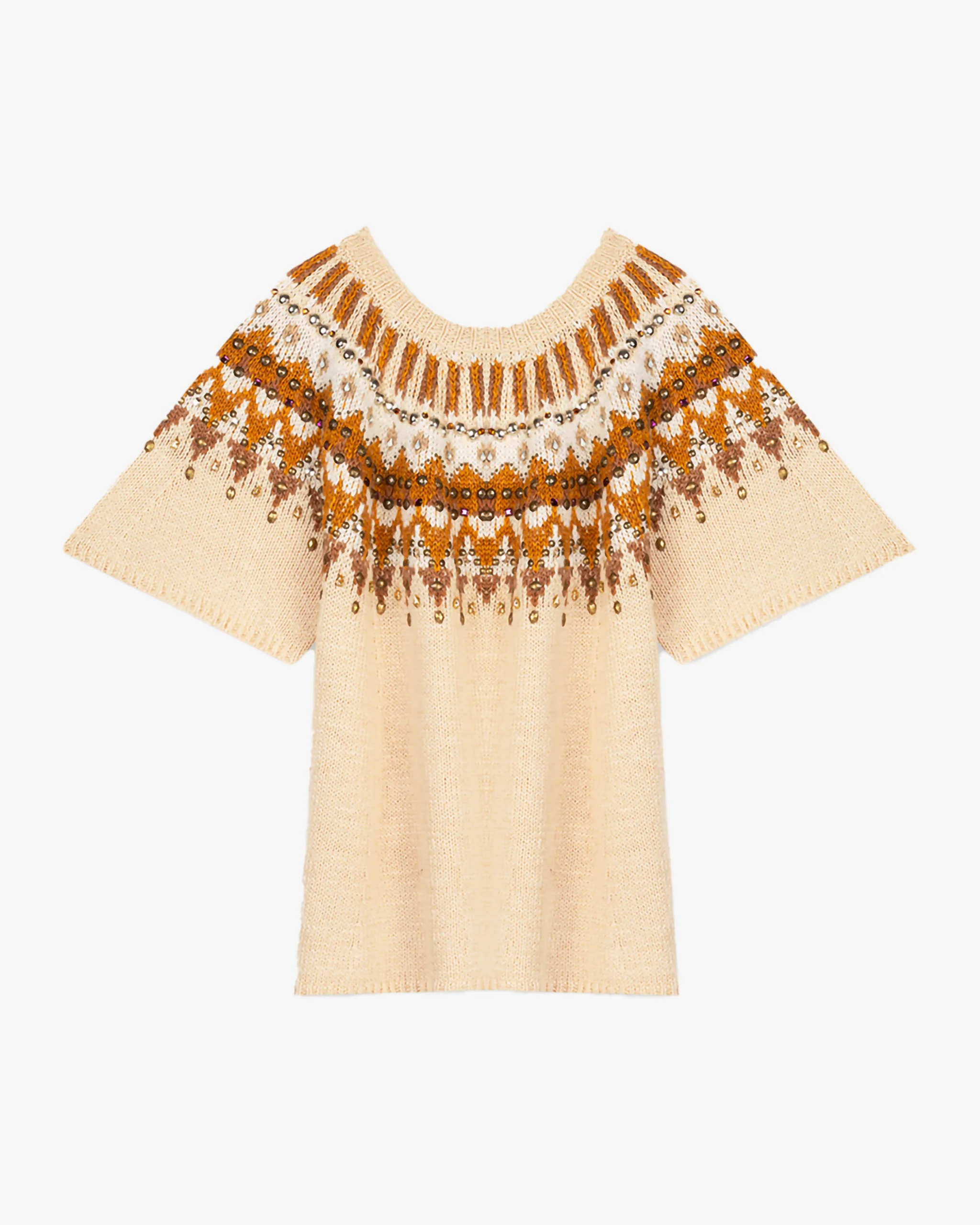 Avec ce pull en laine mélangée, Mes Demoiselles maintient le style incontournable de la femme élégante et décontractée. Il s’impose comme un indispensable dans votre garde-robe. Son fond de couleur écru est rehaussé par de charmantes teintes automnales et des motifs ornés de clous. Les manches courtes légèrement évasées en font un choix parfait pour vos tenues de mi-saison. Ce modèle taille normalement, prenez votre taille habituelle.