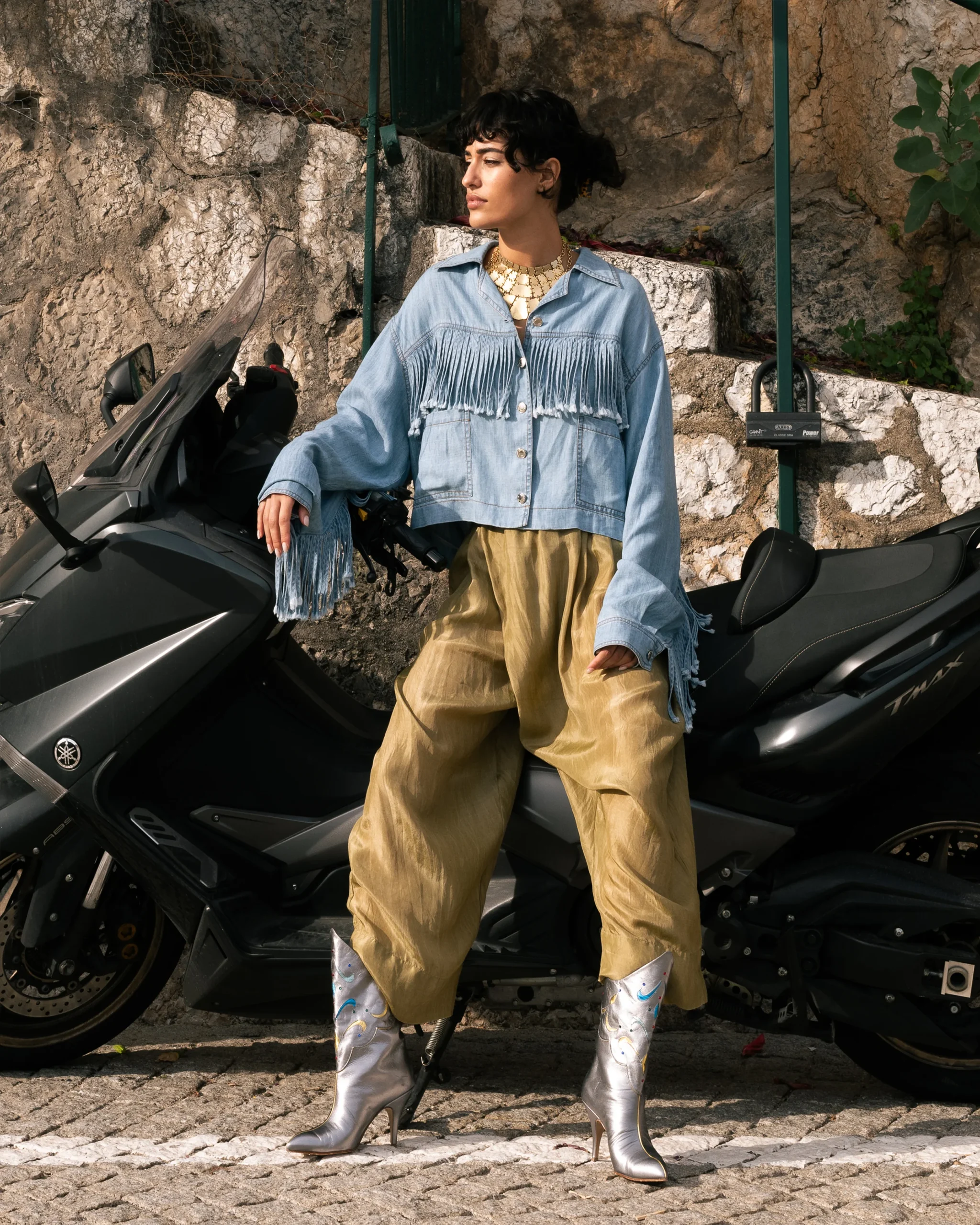 Veste courte esprit rock en mélange de lyocell et de lin, parfaitement conçue pour allier confort et style. Les franges tombant au niveau de la poitrine et du dos ajoutent une touche d’originalité et de dynamisme à cette pièce. Sa coupe souple et large offre un tombé fluide et élégant, vous assurant une allure décontractée et sophistiquée.