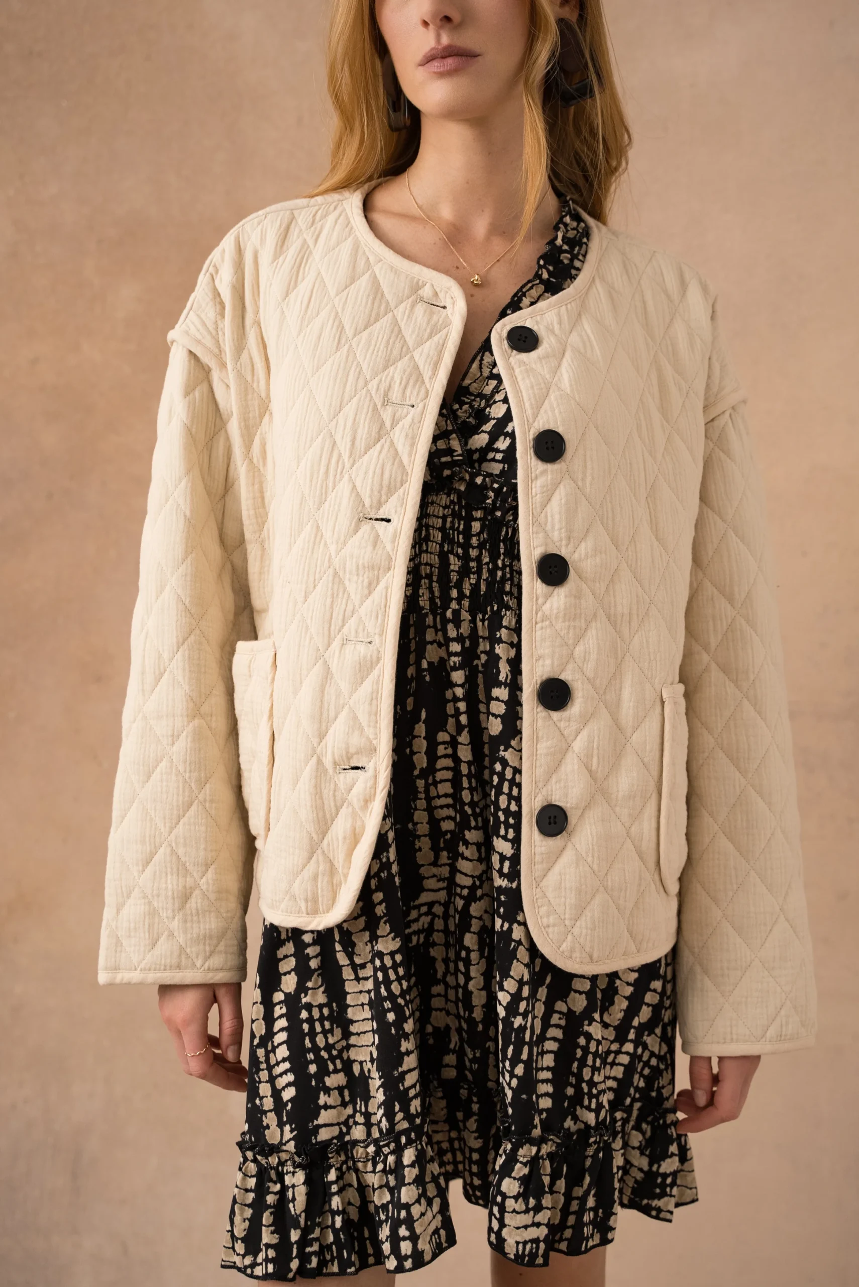 La veste Noamie effet matelassé allie modernité et confort avec son design épuré. Son col rond apporte une touche de simplicité, tandis que la fermeture en patte de boutonnage garantit un ajustement parfait. Les deux poches plaquées sur le devant ajoutent à la fois praticité et style, offrant un détail élégant et fonctionnel. Avec sa texture matelassée, cette veste est idéale pour affronter les journées fraîches tout en restant tendance et raffinée. Parfaite pour compléter vos looks quotidiens avec une touche de sophistication décontractée.